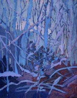Frosted woods is dear to me. I was tromping through the woods on a frosty, late December afternoon. The sun was going down. I was cold. I came across a tangle of vines, brambles and branches. Much of the wood and stalks were quite lavender, blue and crimson. It felt like a scene from an abandoned, enchanted, wintery land or a movie set or something. Anyway, I set my stuff up and began to paint. As most often happens in cold-weather painting, my fingers got stiff, my feet got cold, my nose began to run...but I felt locked in and excited with what was happening. Some days are like that : )7.5" x 9" / acrylic on canvas