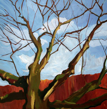 When I was cleaning my studio this past week I hung up a bunch of pieces that had been stacked in piles against the wall. I unearthed a few I'd forgotten about. These paintings are of the same oak tree. The top painting (at sunset) was the first one I did. It's 12" square. I loved the tree so much that the following week I went back to paint it again but this time I brought a large canvas (I can't remember exactly - maybe 36" square?) It now resides in Amsterdam (Cheers Michel & Sonia!). Again I notice how the first time round I was very detailed. I find sometimes when I'm really trying to understand a subject I often paint it this way, and then the second time I have the info stored in my brain and I can just go.